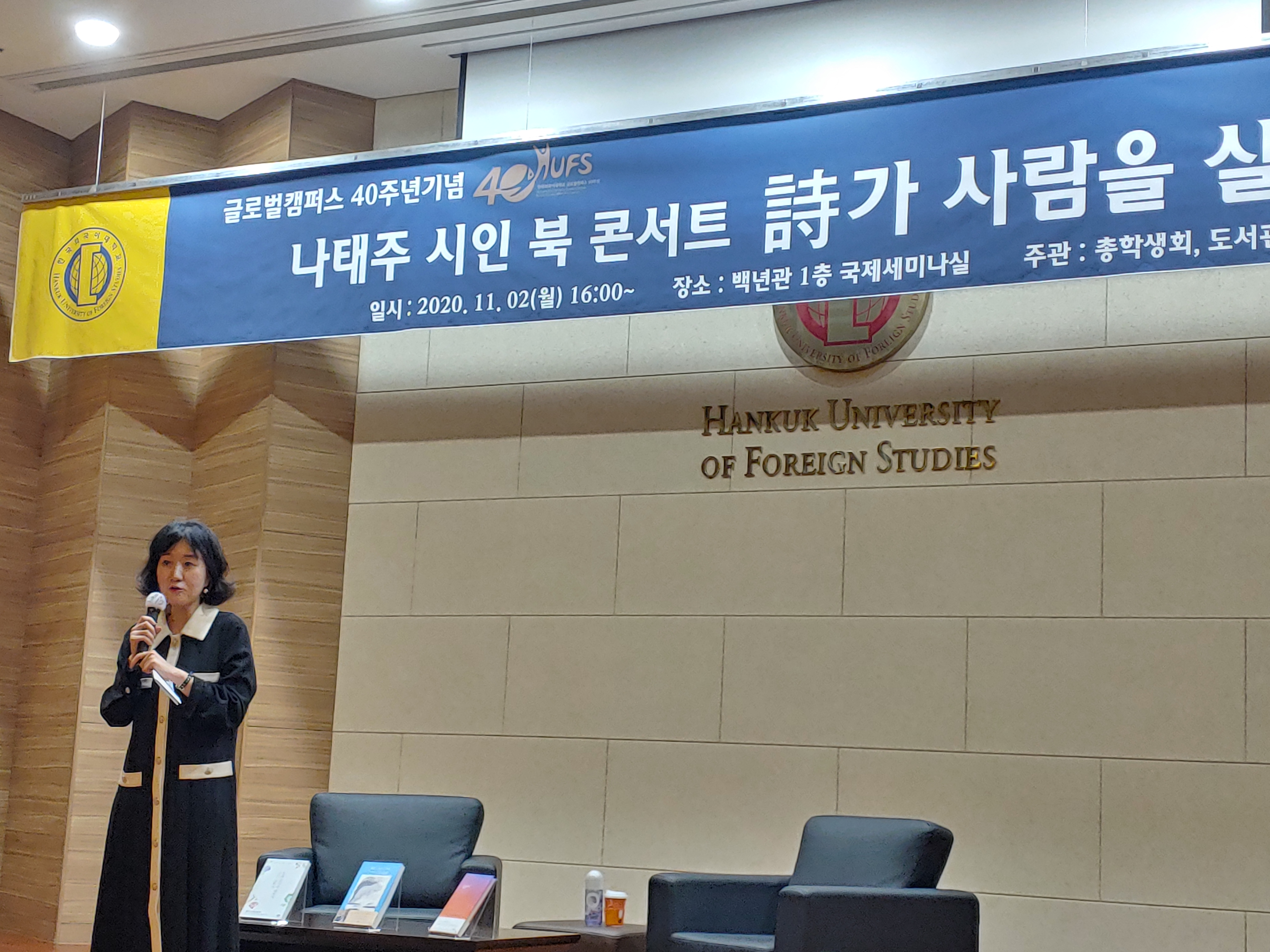 그와는 대조적인 조용한 시인 나태주님의 서정시는 읽을수록 맛이 난다. 2020년 11월 2일 노란 은행잎이 짙은 가을 향기를 풍기는 한국외국어대학교 용인, 글로벌 캠퍼스에서 “풀꽃 시인 나태주와 함께하는 북콘서트”가 열렸다. 글로벌 캠퍼스 창립 40주년을 맞이하여 총학생회와 제자 최성은교수가 도서관장으로 있는 글로벌 캠퍼스 도서관이 공동으로 주최했다. 2020년은 코로나 바이러스 19 때문에 공개강좌가 거의 개최되지 않았는데 이번에 그를 초청해서 진행한 북 콘서트는 2020년 글로벌 캠퍼스의 가장 의미 있는 행사가 되었다.