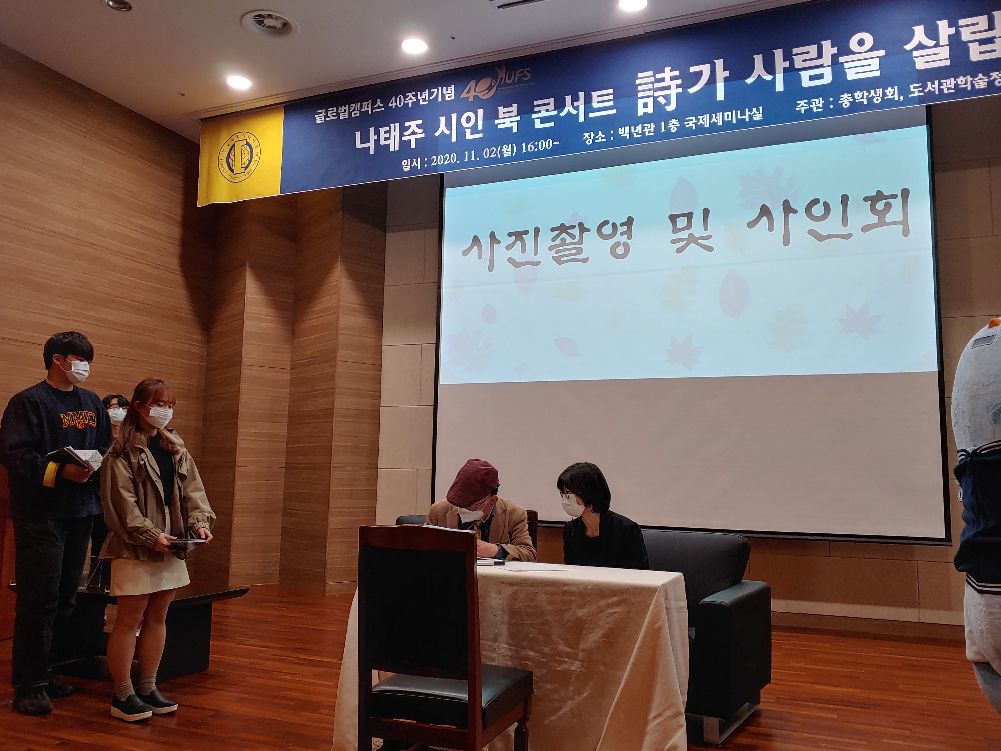 코로나 바이러스19 방역규칙을 철저히 지키며 진행된 “풀꽃 시인 나태주와 함께하는 북콘서트”는 무척 인상 깊었고 좋았다. 그 큰 강당에 미리 예약한 50여명 학생들만 충분한 거리를 두고 앉아서 진행되었다. 나머지 학생들은 실시간 온라인 중계로 북 콘서트를 지켜볼 수 있었다. 모두들 마스크를 쓴 채, 강연 할 동안 만 시인은 마스크를 벗었다.